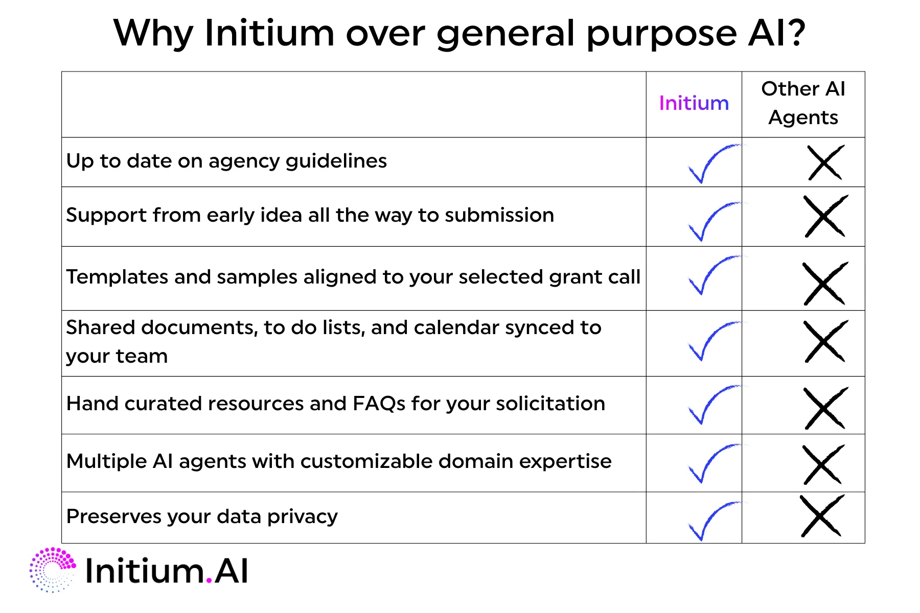 While general AI assistants such as ChatGPT provide broad-purpose support, Initium focuses specifically on grant development, offering structured tools and collaborative infrastructure aligned with the requirements of academic funding proposals.